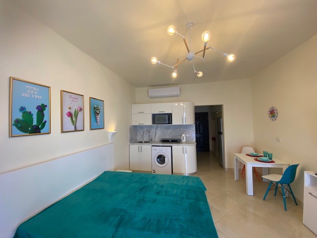 The studio is 50 sq.m., spacious and bright. A magnificent view of the pool and the sea opens from the large balcony.