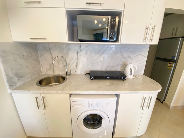 The kitchen is equipped with all the necessary equipment: a stove, a microwave oven, a kettle, a juicer, a mixer.