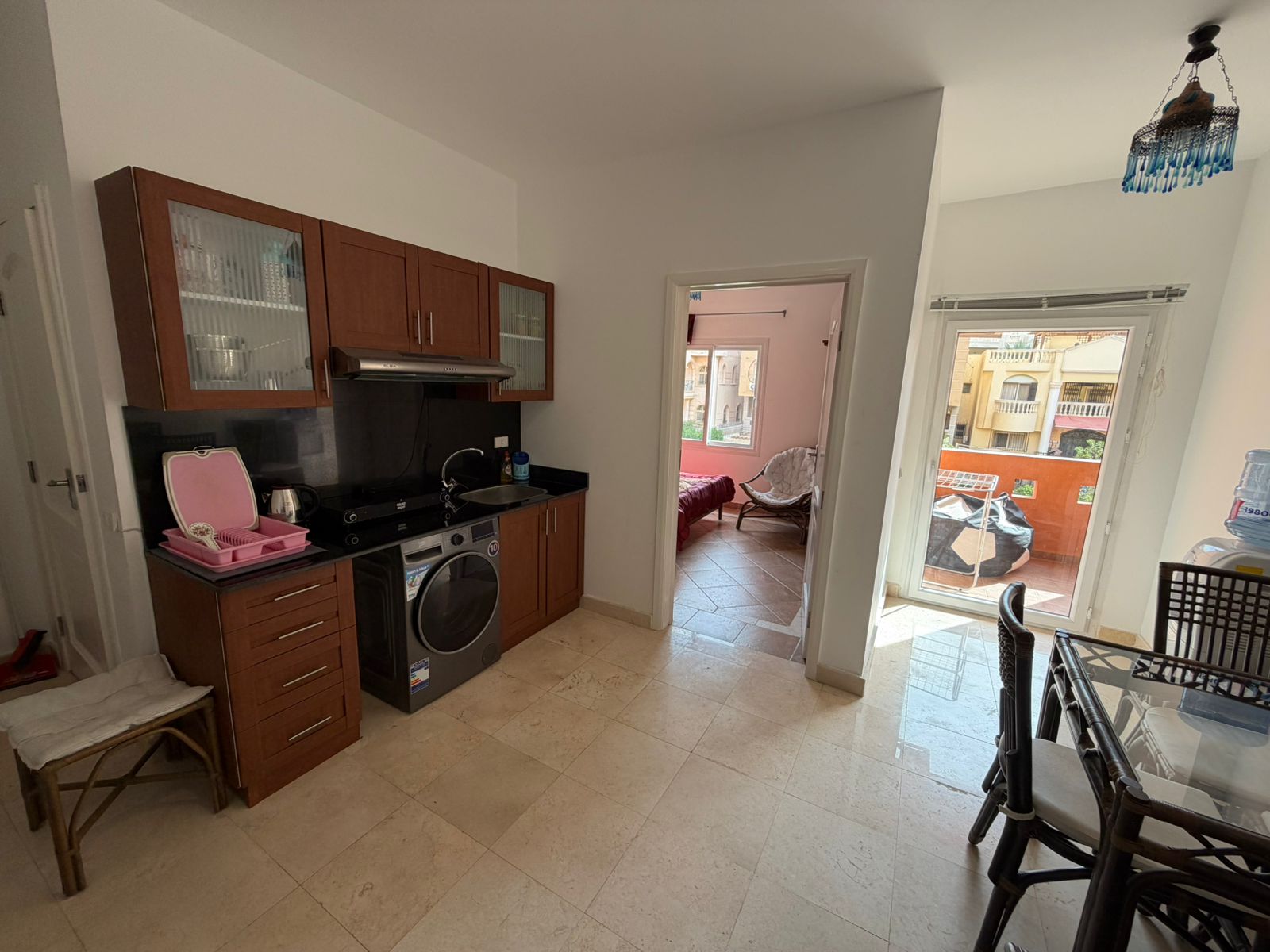 A comfortable one-bedroom apartment with a balcony and partial sea view is situated on a high first floor.