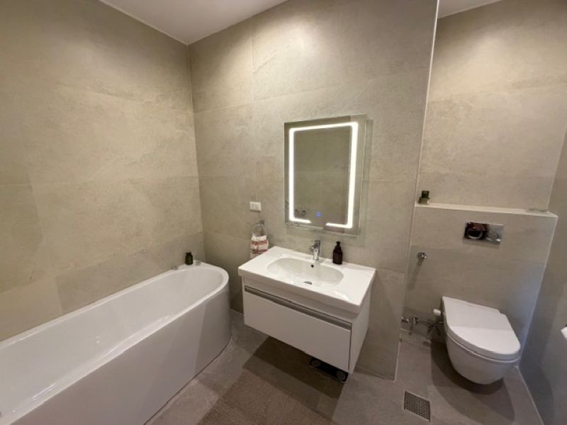 The layout includes a spacious living room combined with an open-plan kitchen, two comfortable bedrooms, two bathrooms, and two balconies. The apartment has a new stylish renovation completed with modern design solutions and high-quality materials.