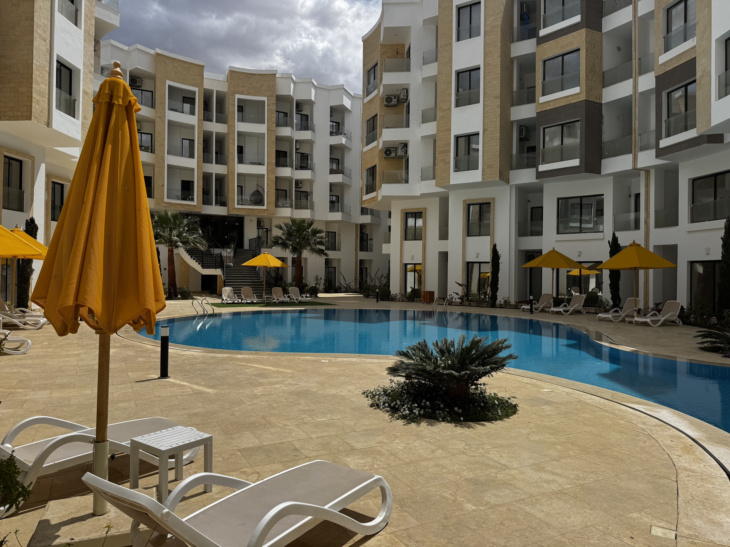 Планировка: гостиная с кухней открытого плана, 1 спальня с кондиционером, 1 ванная комната, 1 балкон с видом на бассейн.